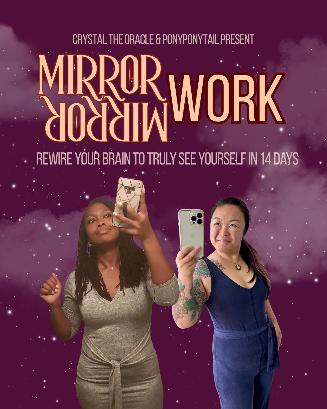 The way you see yourself will be the way you move through the entire world. If you struggle with self love, self admiration...self appreciation...self trust...self esteem...it's not your fault. If you question yourself more than you'd like, or feel unsure of your power, you are not alone. All of our modern world is set up to cause your brain to question your self worth. But here's the good news, that can be easily rewired. Join Crystal the Oracle and PonyPonyTail on a 14 day Mirror Work Challenge. Two live teachings and daily quick proven mirrorwork challenges will shift your brain and leave you with a different, juicier, more beautiful, joyful and powerful perspective on the most important person in your world...YOU!