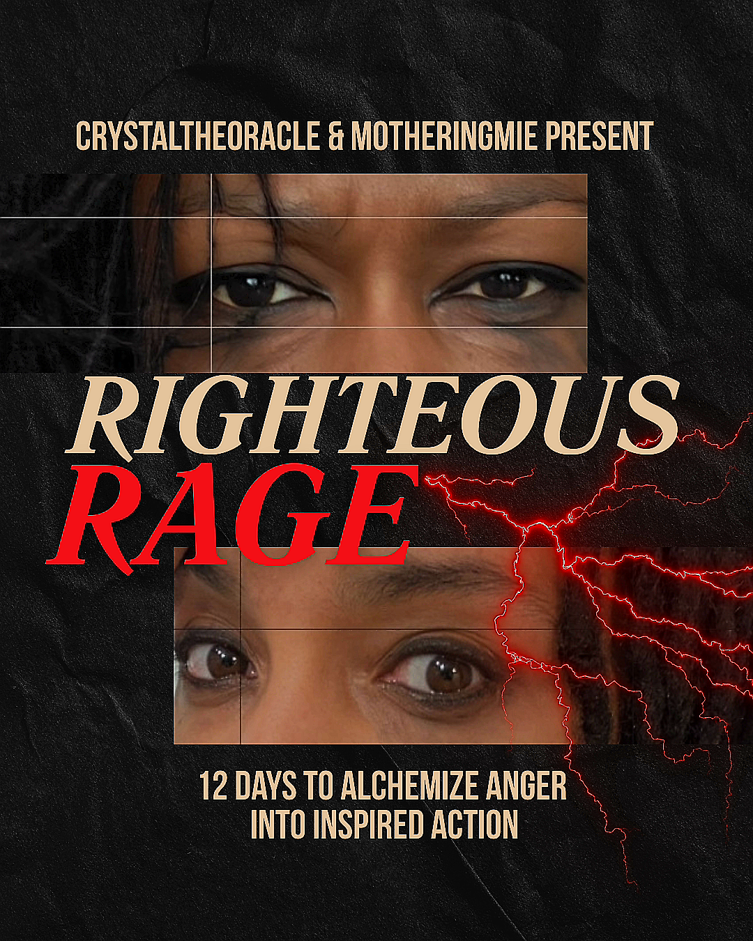 Join Crystal the Oracle and Mothering Mie for 12 days of quick but powerful somatic practices, deep healing, community and release. Two Monday night live teachings and daily quick, proven techniques that will move your anger from stuck frustration to fierce, focused energy, helping you step into the free, expansive, righteous, empowered version of yourself you’re meant to be.